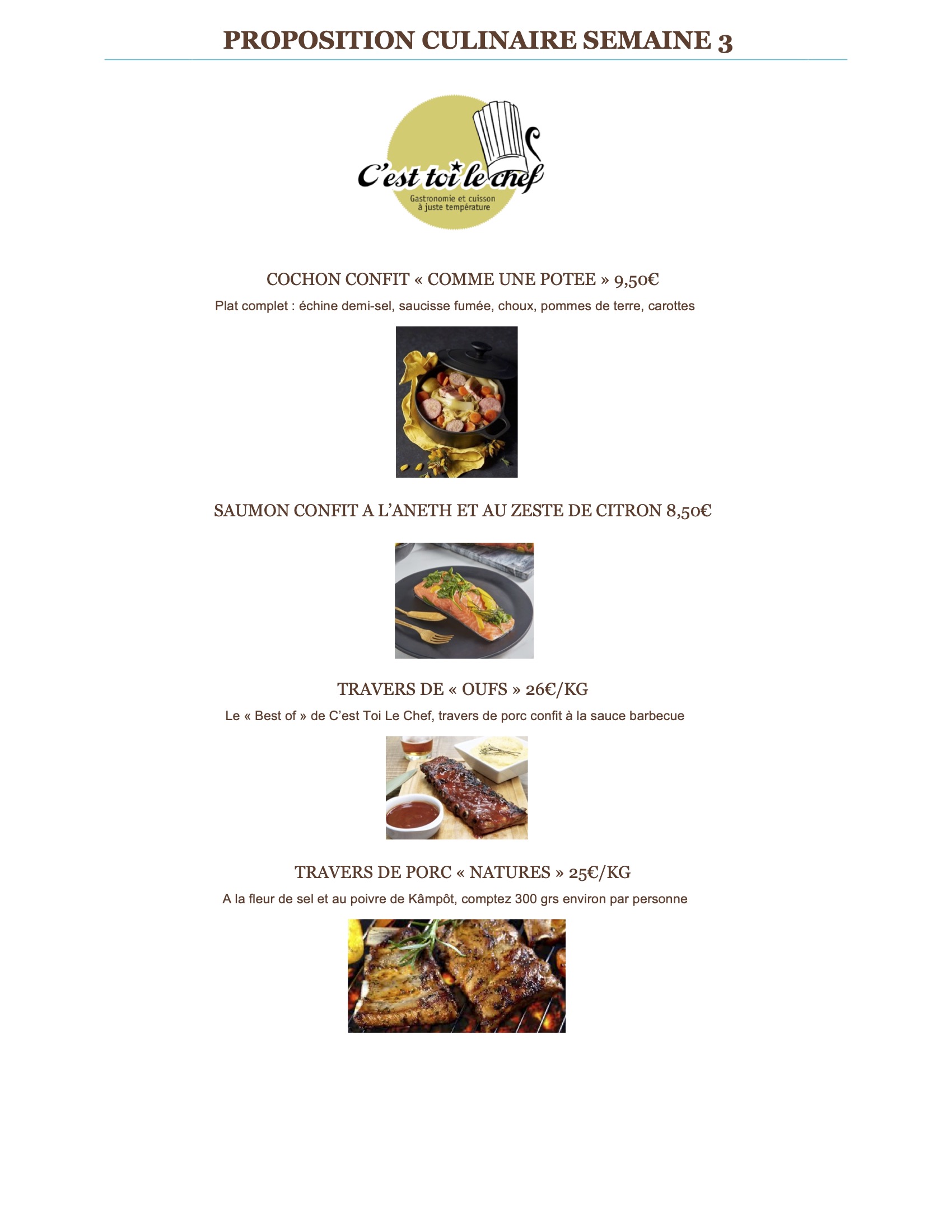 C'est Toi Le Chef, propose des plats cuits sous vide faits maison, de qualité gastronomique, sains, sans additifs, facile à remettre en température et à accommoder selon ses envies en toutes situations. IMPORTANT : les commandes pour la semaine suivante sont impérativement à passer avant le dimanche soir